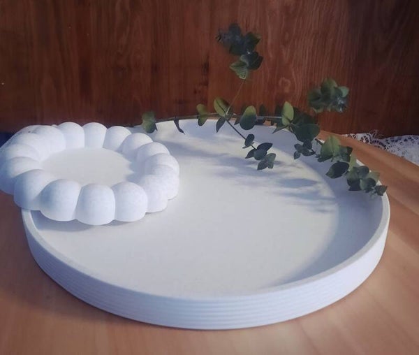 Das handgefertigte Tablett mit einem Durchmesser von 25 cm und einem markanten Querrillenrand ist der perfekte Begleiter für deine Dekorationen.
