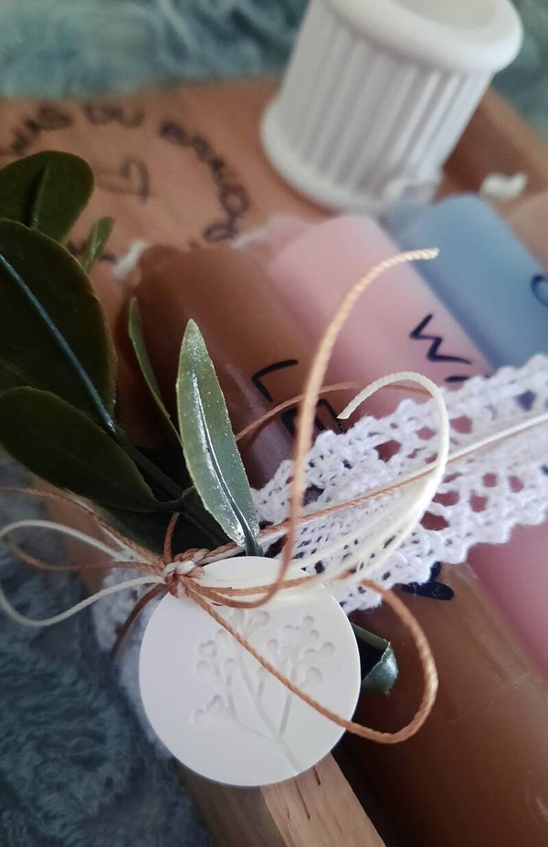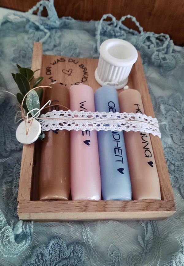 Schönes Geschenkset bestehend aus 4 Kerzen mit z.B. Hoffnung, Liebe, Wärme und Gesundheit im Klötzchenhalter mit Kerzenhalter mit Rillen.