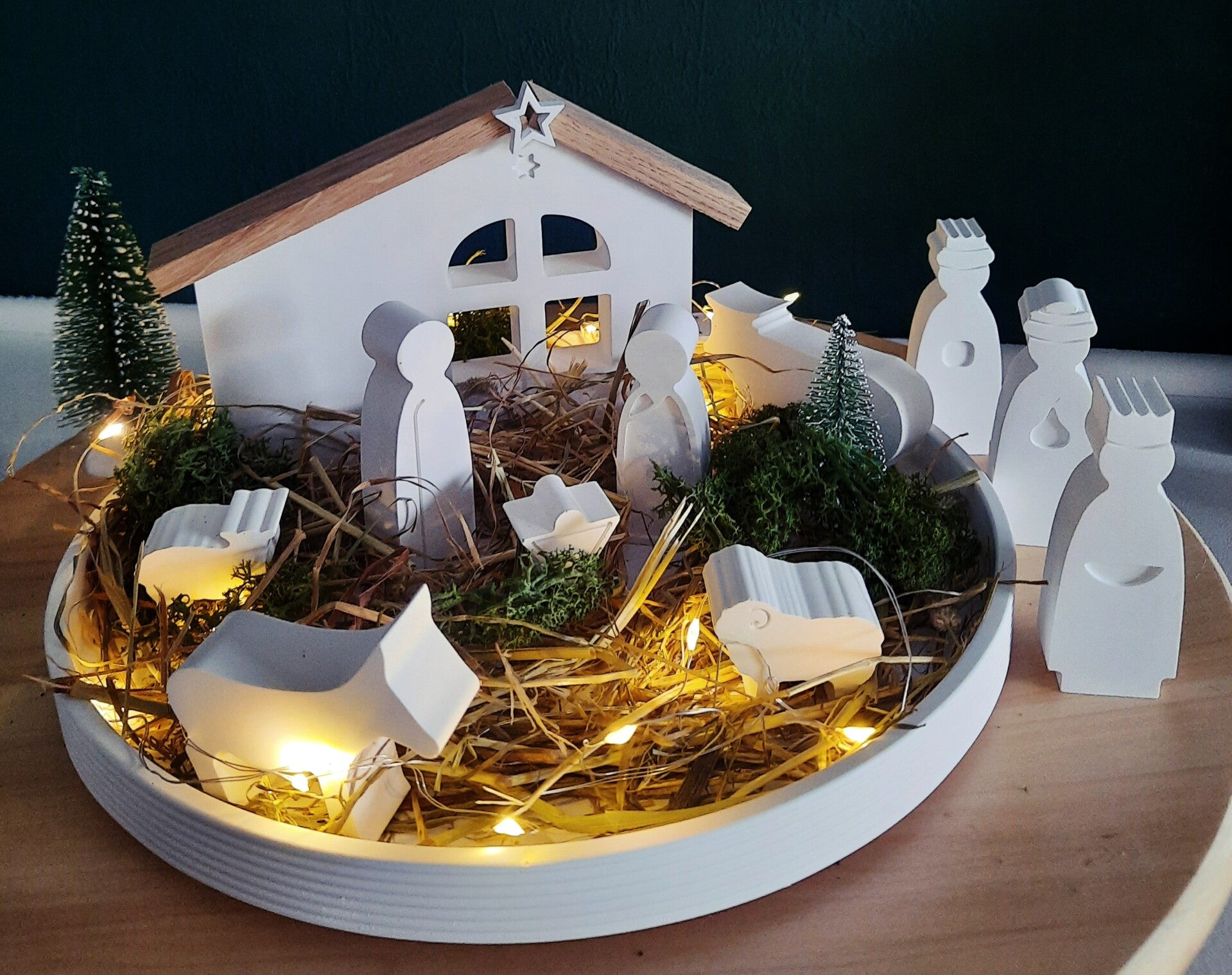 Verleihe deinem Zuhause eine zauberhafte, festliche Atmosphäre mit dieser einzigartigen handgefertigten Weihnachtskrippe. Liebevoll gestaltet und bis ins kleinste Detail ausgearbeitet, besteht dieses Set aus: