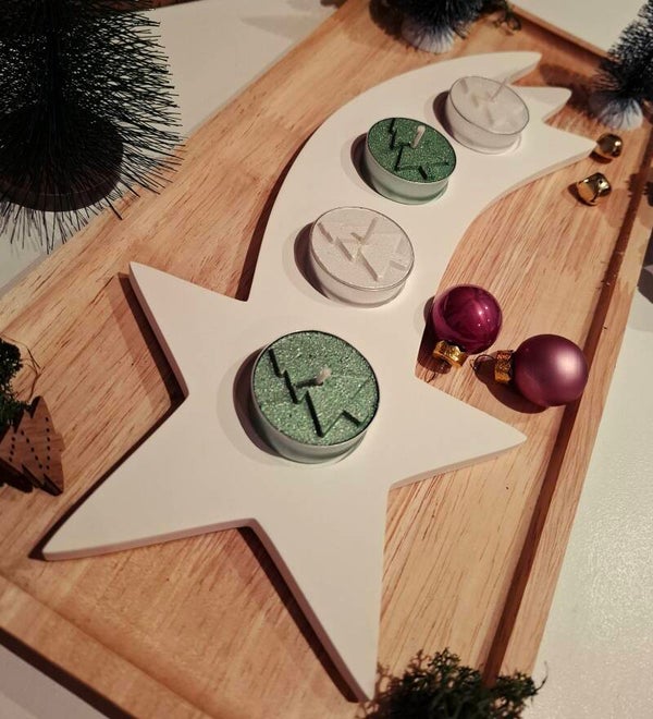 Verleihe deinem Zuhause einen Hauch von Magie mit diesem handgefertigten Teelichthalter in Form einer Sternschnuppe. Liebevoll in meiner Werkstatt gegossen und gestaltet, bietet er Platz für vier Teelichter und schafft so ein warmes, stimmungsvolles Licht.