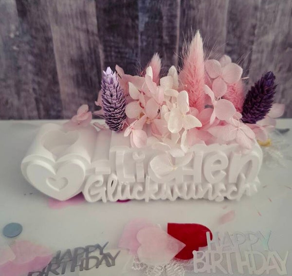 Lichtgruß zum Geburtstag – Kerzenhalter „Herzlichen Glückwunsch“ mit Platz für Trockenblumen