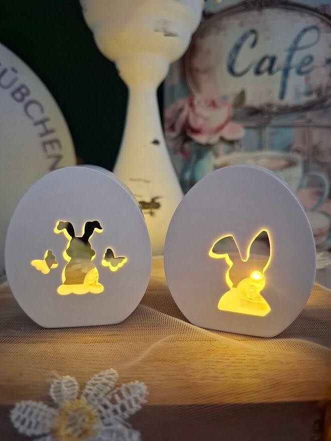 Diese kleinen Ostereier sind ausgehöhlt und bieten Platz für ein Ballonlicht. Du legst das Licht hinein, drehst das Ei um – und schon strahlt das ausgeschnittene Hasenmotiv sanft durchs Ei. Je nachdem, wie du es stellst, leuchtet das Motiv vorne oder hinten. So entsteht ein stimmungsvolles Licht‑Osterei, das genau dort steht, wo es dir am besten gefällt.